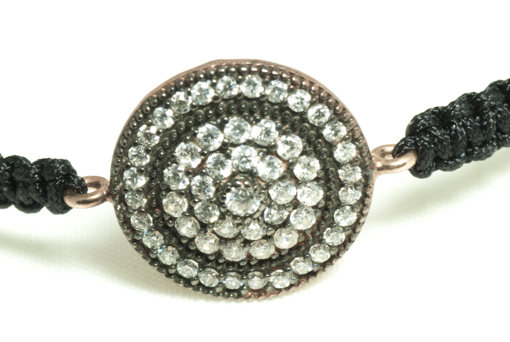 Pulsera realizada en macrame negro y roseta en plata rosa engastada con circonitas.